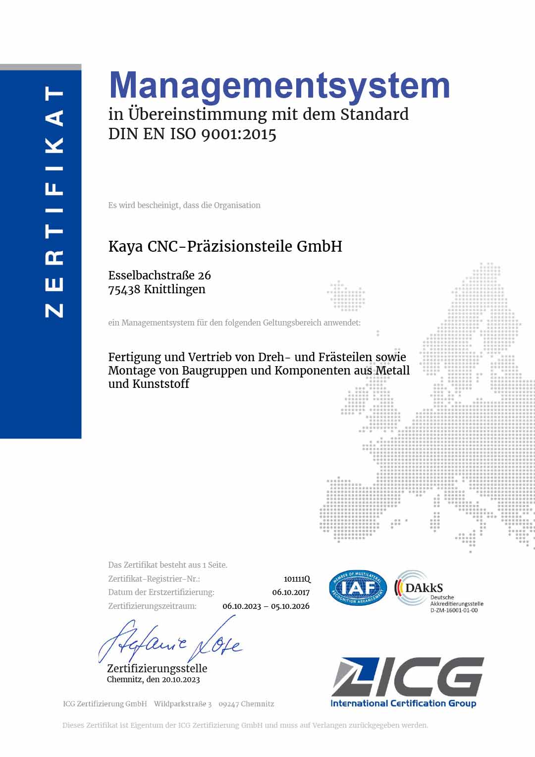 Apropos Qualität: Kaya CNC Präzisionsteile ist nach DIN EN ISO 9001:2015 zertifiziert. Unser Qualitätsmanagement erfüllt damit hohe internationale Anforderungen. Wir sind des Weiteren TÜV-umstempelberechtigt und können dadurch Spezifikationen von Kunden etwa aus dem Medizin- und Lebensmittelbereich auftrags- und chargenbezogen dokumentieren.